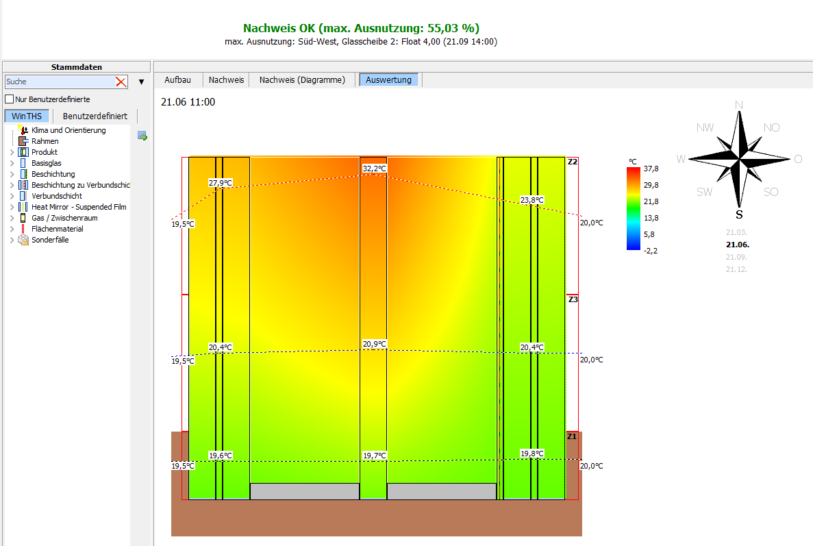 Thermal stress analysis software for glazing systems. It calculates thermal stresses in glass due to solar radiation and partial shading over time (daily/annual profiles) using real climate data. Helps anticipate risks such as breakage from thermal loading by accounting for climatic orientation, edge quality, glass structure and fills.