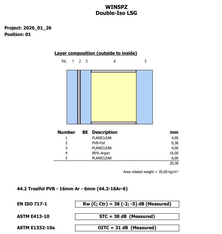 A sound and acoustics extension/editor based on the WINSLT framework. It lets users manage and input acoustic properties (e.g., Rw, STC, OITC, Ctr), use a sound data database, and integrate this information into projects and outputs. Effectively a module for sound values and acoustic performance data tied to glass and façade configurations