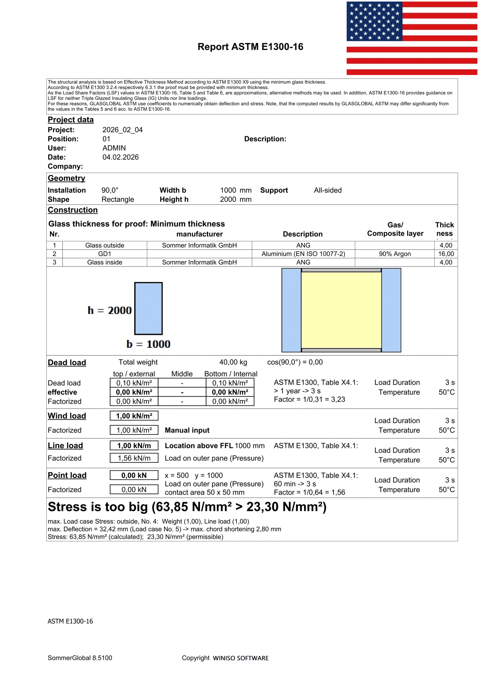 GLASGLOBAL® ASTM specialized for glass structural design based on the ASTM E1300-16 standard. It performs static structural analysis of glass panels and laminated glass (VSG) under loads such as snow, wind, dead weight and thermal loads, checking stresses and deflections against allowable limits and producing clear result reports.