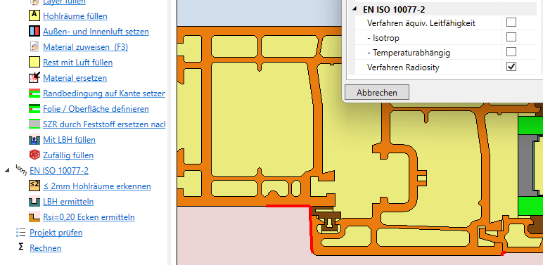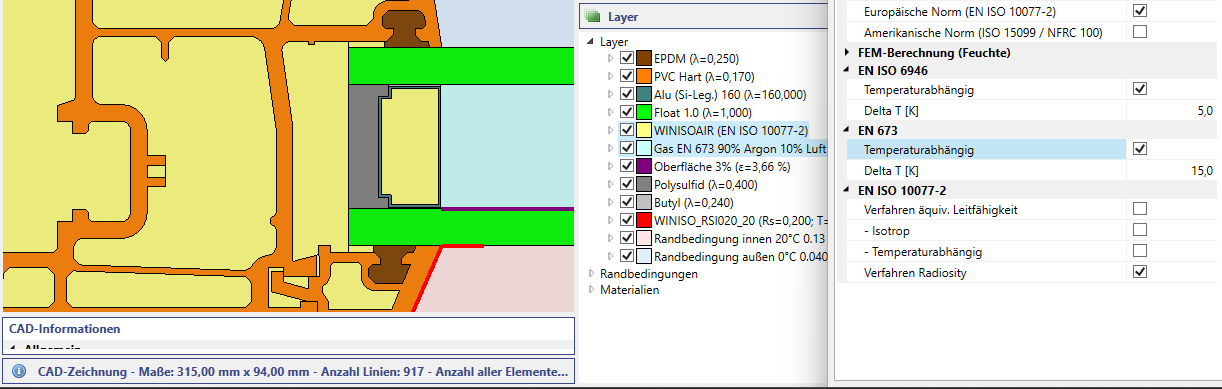 - Calculation according to the “radiosity model” (new cavity model according to EN ISO 10077-2:2018) and with equivalent conductivity (EN ISO 10077-2:2012/2018)